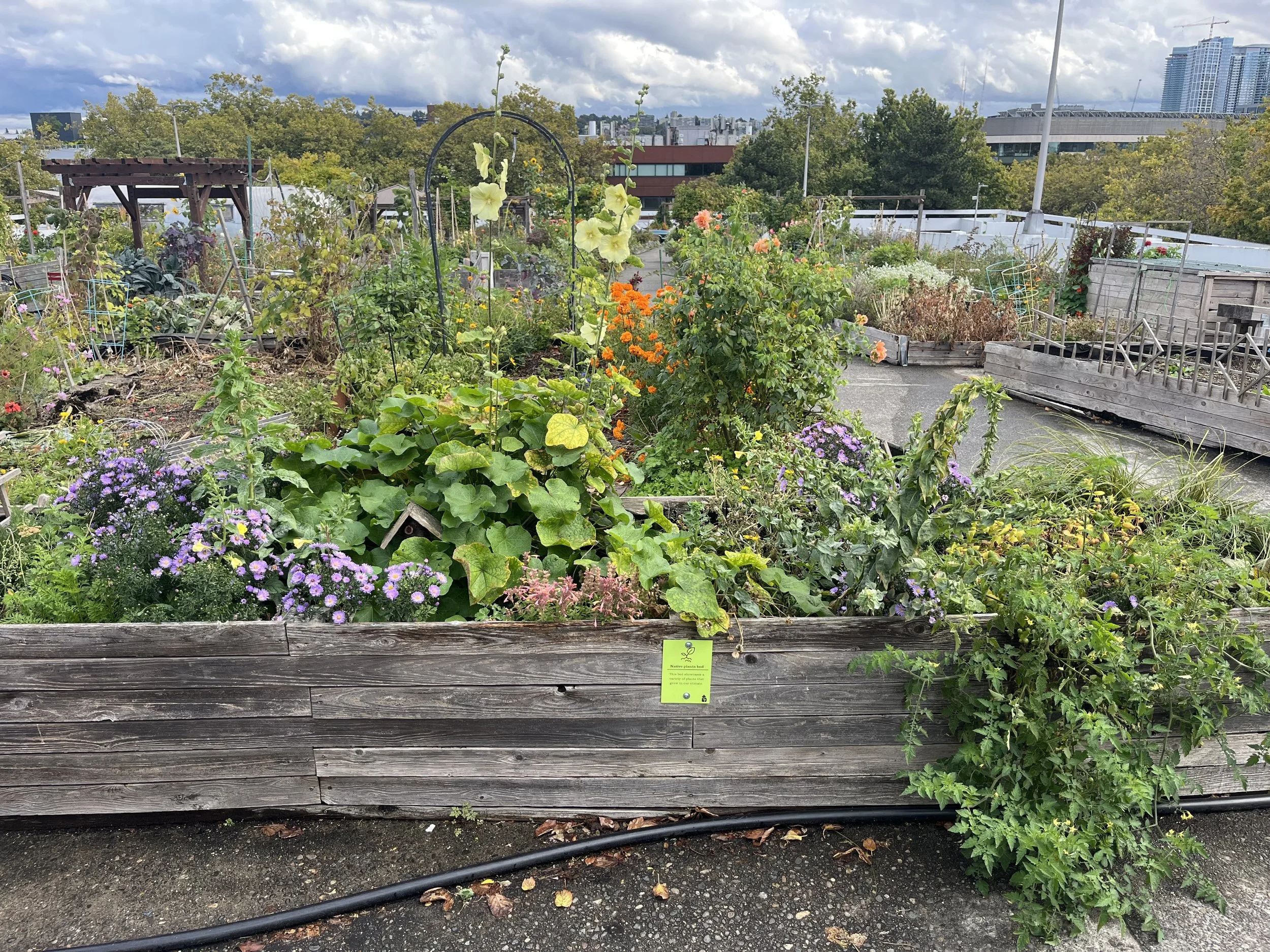 A group of volunteers (ranging from complete beginners to experienced gardeners) has been stewarding three small plots at the UpGarden P-Patch on top of a parking garage near the ArtHOME since September 2025.